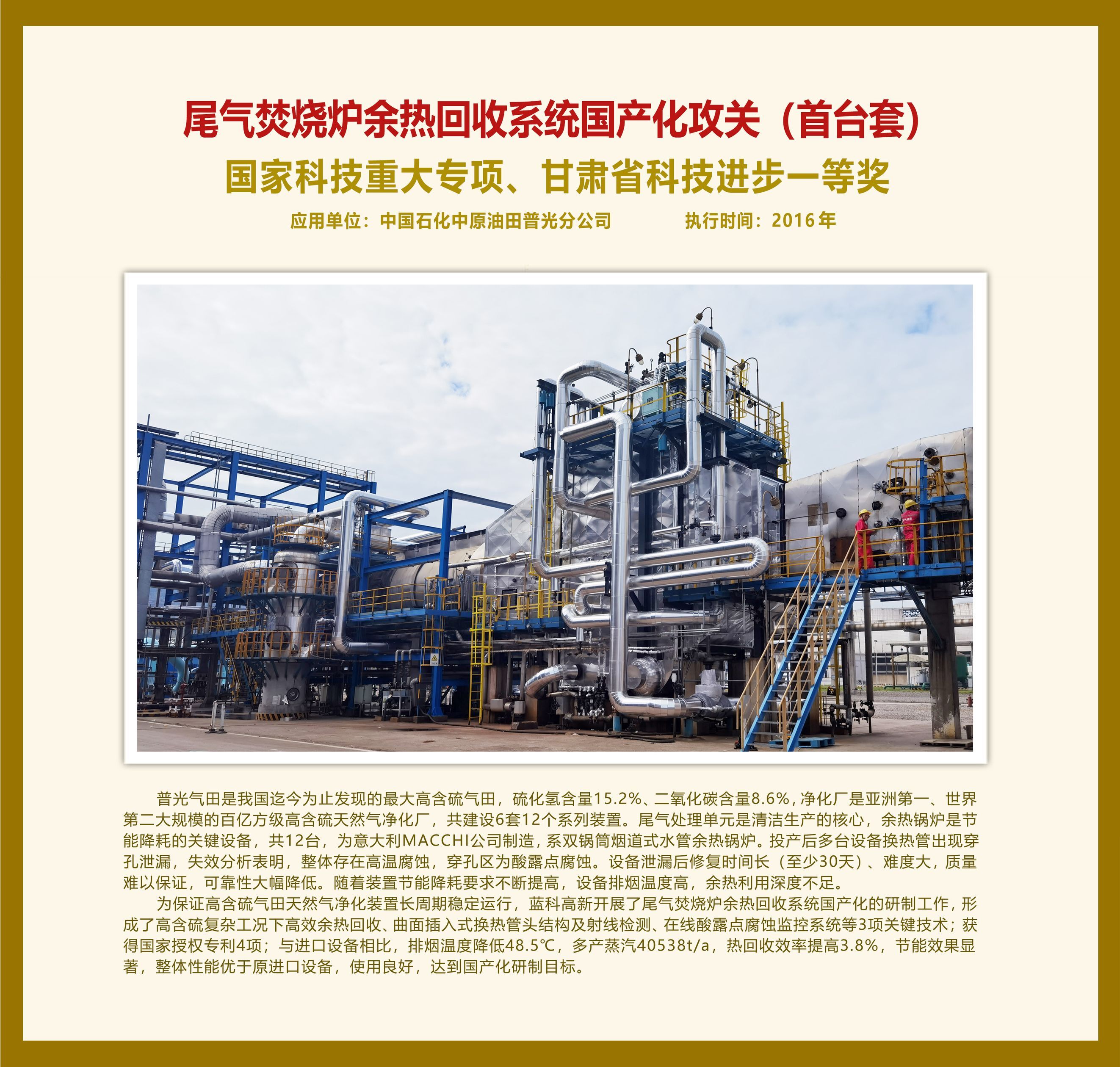 尾氣焚燒爐余熱回收系統 國產化攻關(首臺套)國家科技重大專項、甘肅省科技進步一等獎