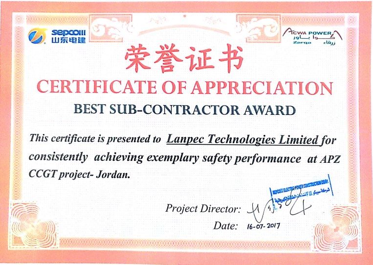 約旦APZCCGT項(xiàng)目獲最佳分包商榮譽(yù)
