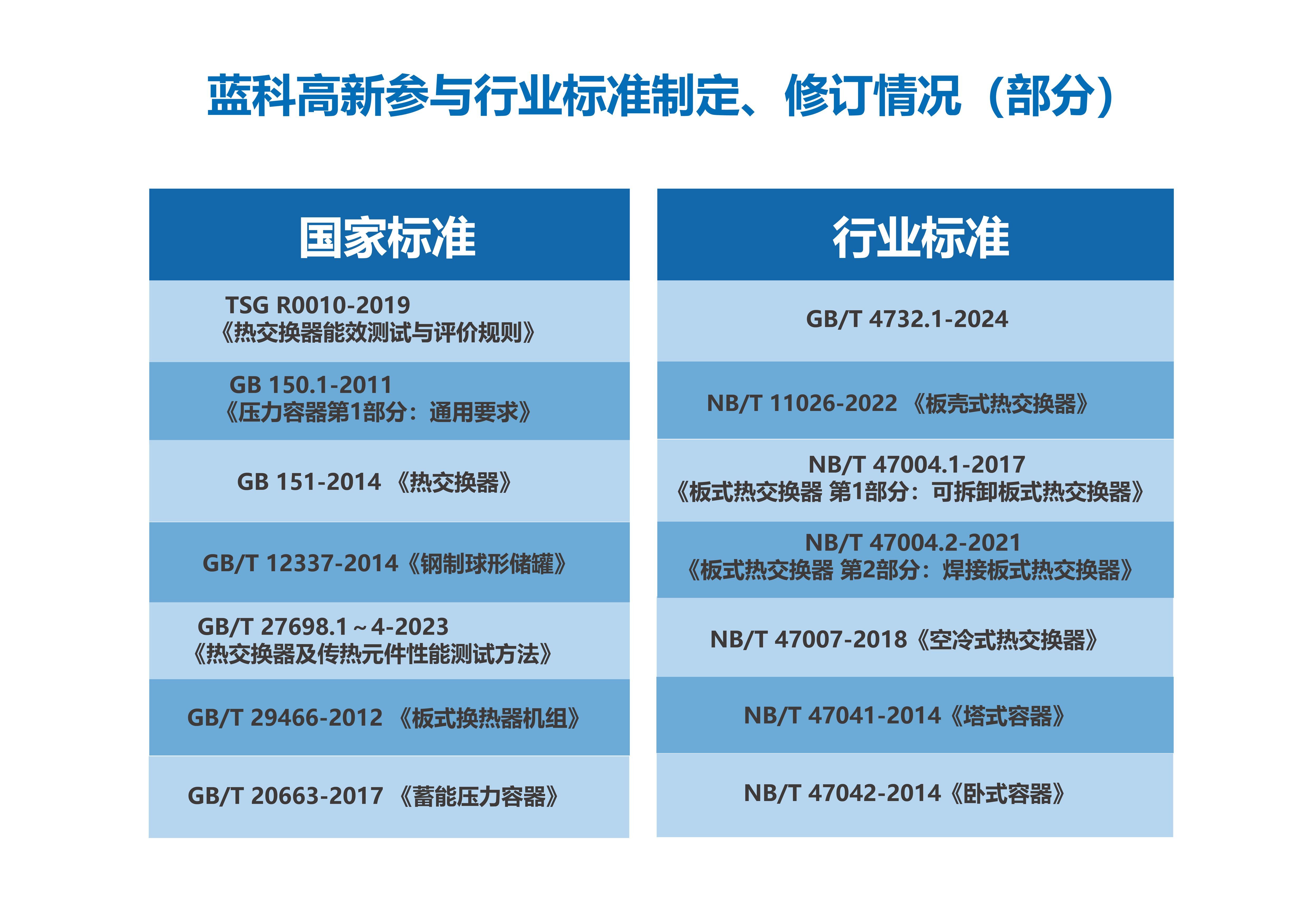 ???藍科高新是全國鍋爐壓力容器標準化技術委員會熱交換器分技術委員會、移動式壓力容器分技術委會和低溫容器分技術委會依托單位;是中國石油和石油化工設備工業協會石油鉆采機械專業委員會等9個委員會的主任委員、副主任委員或秘書長單位,同時還參加其他28個行業技術協會(學會)。主辦行業核心期刊《石油礦場機械》《石油化工設備》;承擔相關行業標準制修訂與宣貫,產品安全注冊與評審等多項工作,共制修訂國家標準、行業標準及地方標準80余類,430余項。