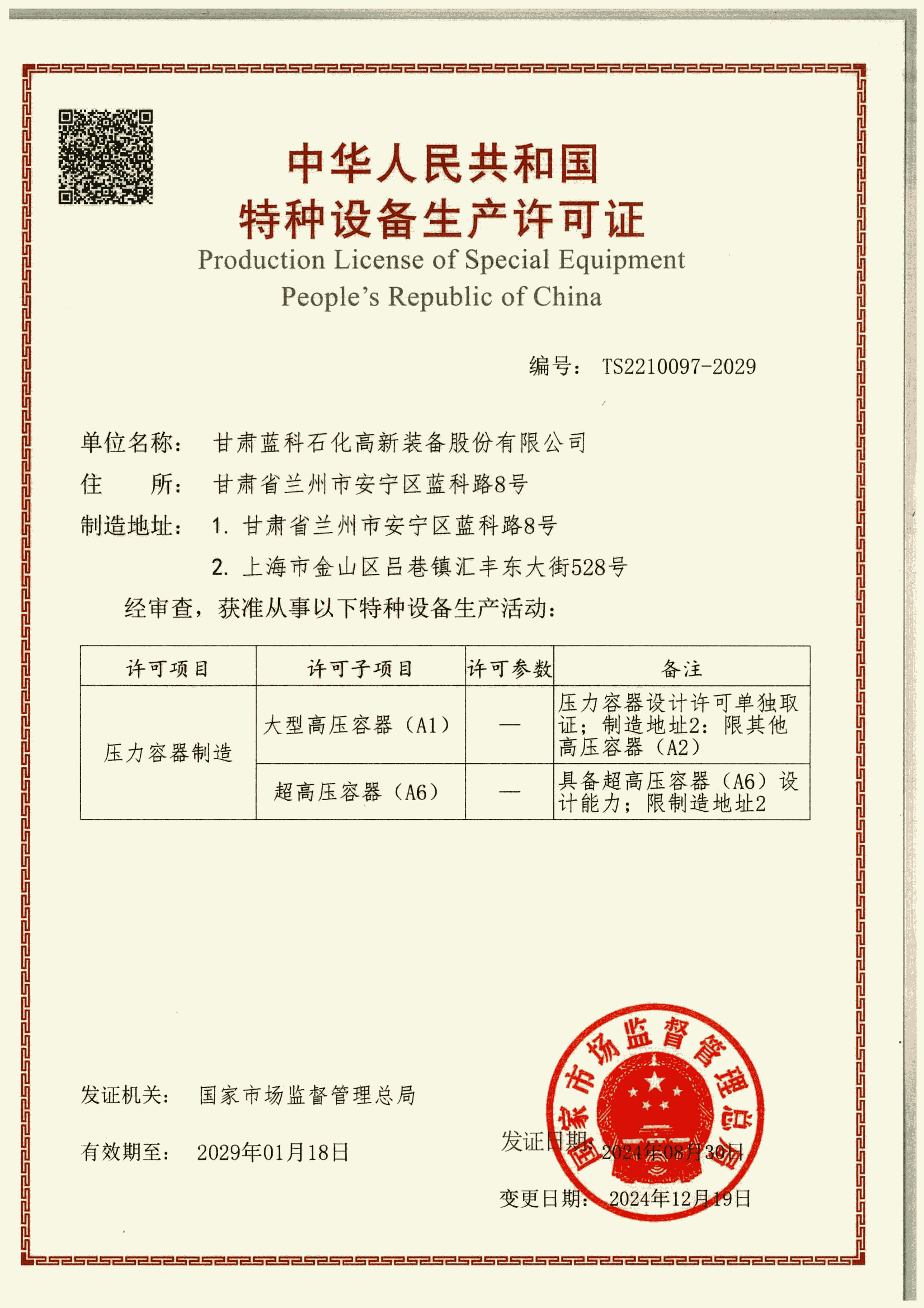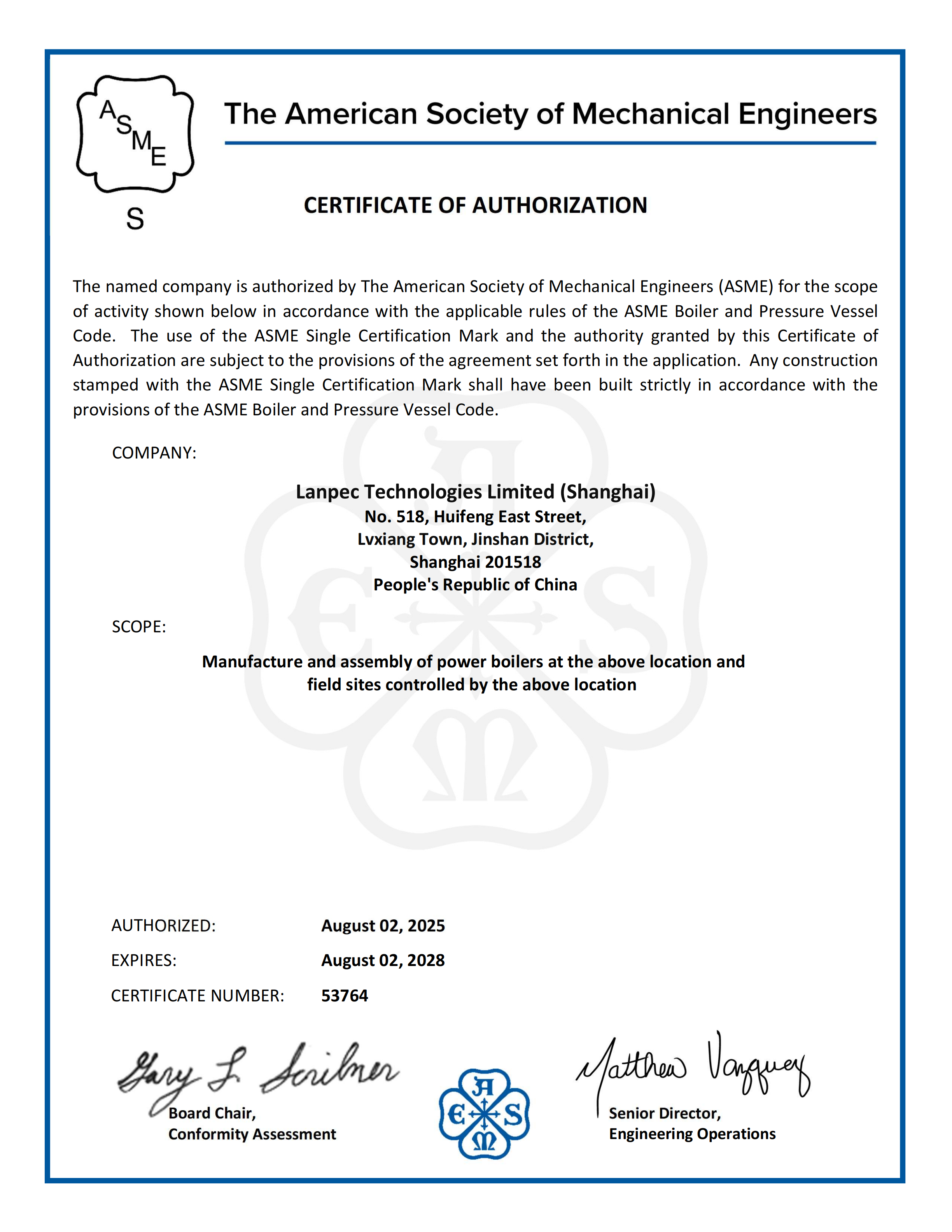 ASME S鋼印授權(quán)證書