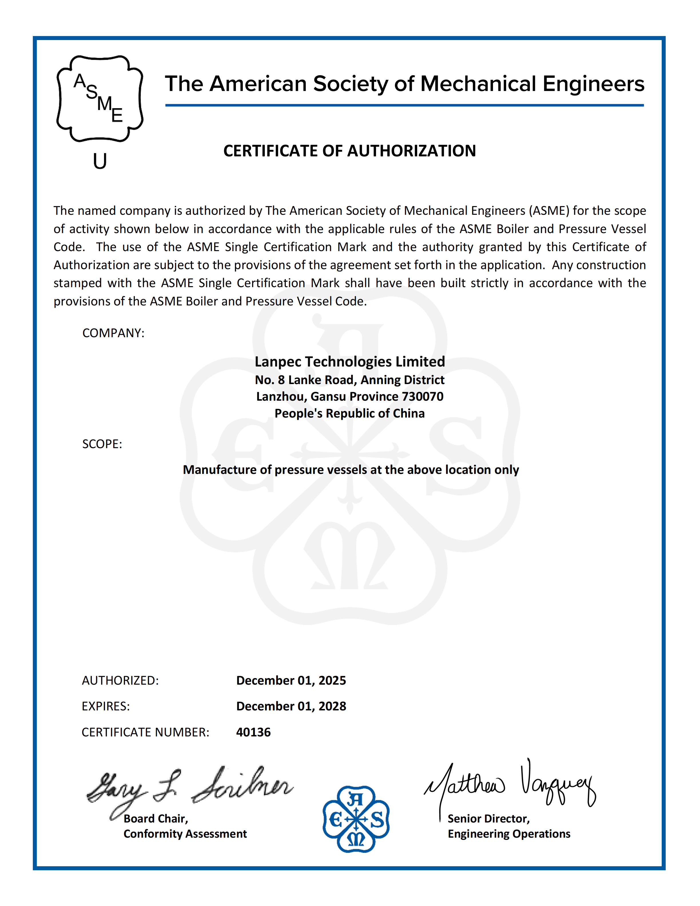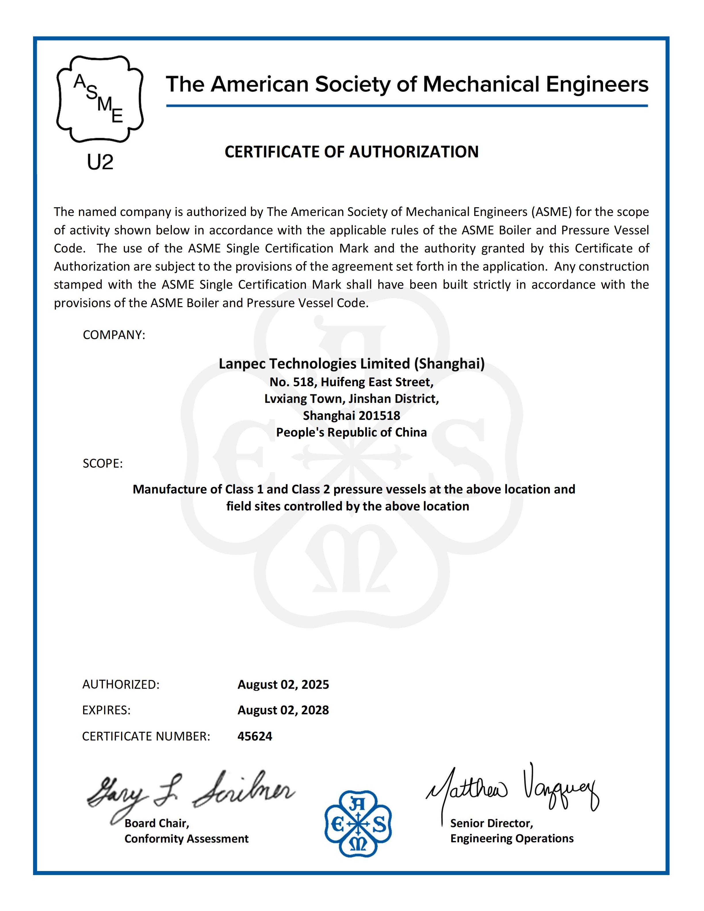 ASME U2鋼印授權(quán)證書
